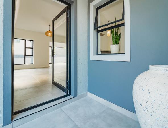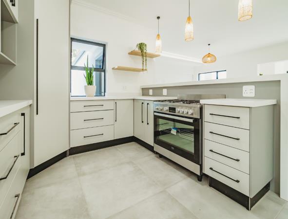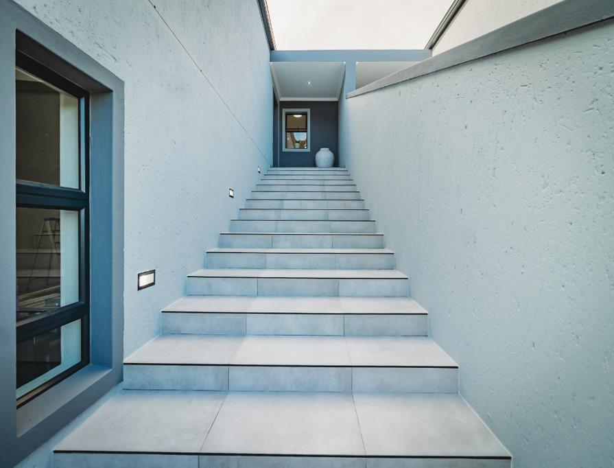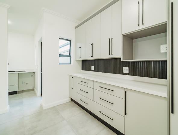 A beautiful staircase leads to the welcoming entrance. The kitchen is a standout feature with its modern finishes, breakfast nook, separate scullery, and direct access to a private courtyard. The open-plan lounge and dining area create an inviting space for everyday living, while a separate braai room with a built-in braai and sliding doors extends to the outdoor area.