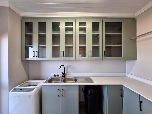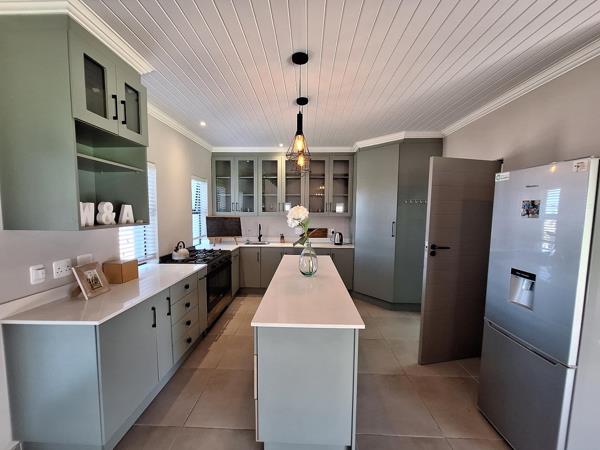 The upscale cottage-style kitchen is elegantly appointed with generous cabinetry, a centre island, gas hob paired with an electric oven, a pantry cupboard, and a separate scullery that can be closed off with a door.