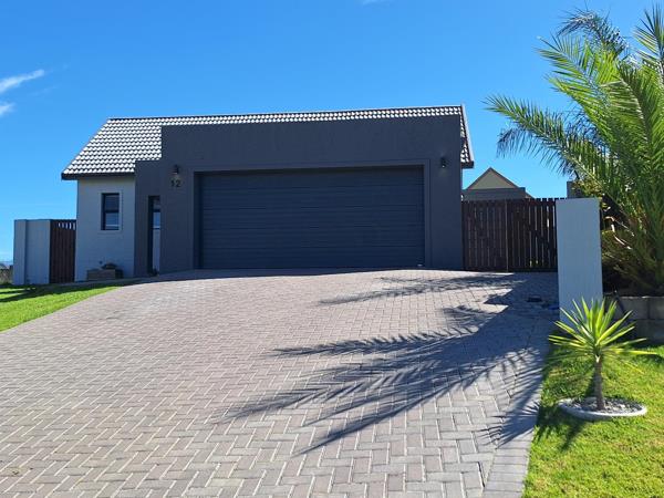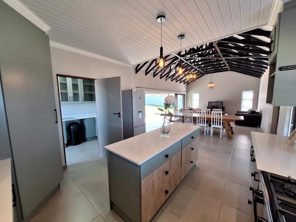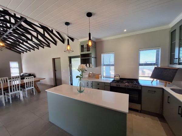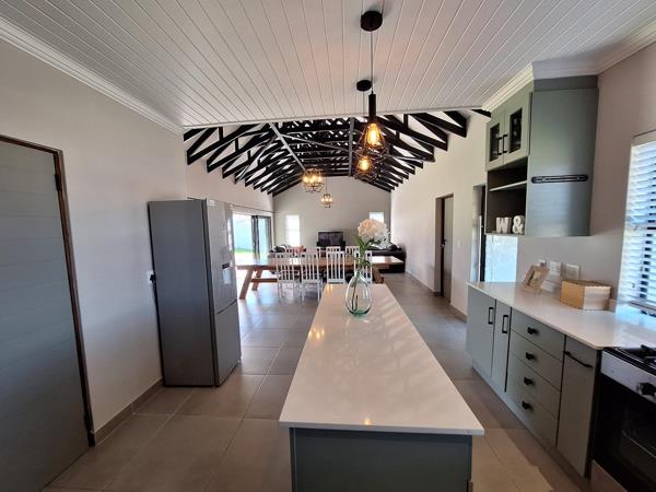 Upon entering the premises, guests are greeted by lofty ceilings adorned with exposed wooden trusses. The expansive dining area and lounge seamlessly flow into a covered stoep featuring a built-in braai, offering access to a fully enclosed private garden with picturesque mountain vistas in the background.