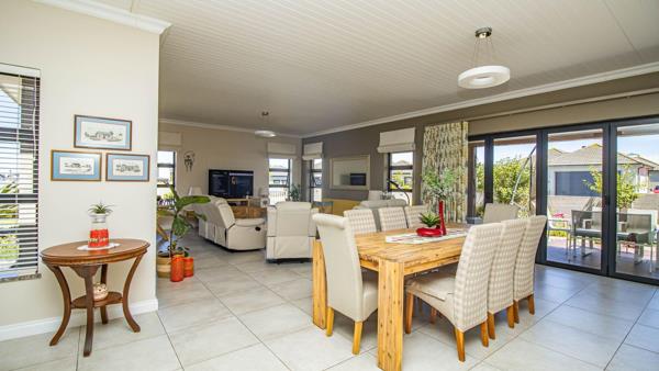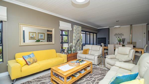 Open-plan living and dining areas opening up with stacking doors onto the patio overlooking the mountains,