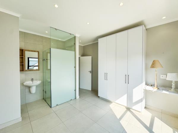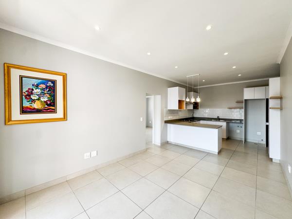 Two spacious bedrooms provide a restful retreat, with the main suite enjoying the luxury of an en-suite bathroom. Both bathrooms are finished to perfection, with ceramic tiles and sanitary ware supplied by Stiles. Practical features such as fibre-ready connectivity, a covered carport, and solar geysers ensure both comfort and energy efficiency.