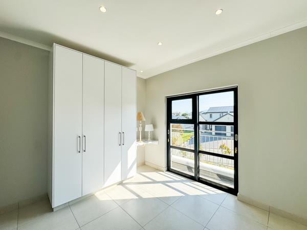 The open-plan living space is the heart of the home, featuring a sleek, modern kitchen fitted with a Defy stainless steel oven and gas hob, complemented by high-quality finishes. From here, the space flows effortlessly to the lounge and out to a private balcony with a built-in braai perfect for relaxed evenings and scenic sunsets.
