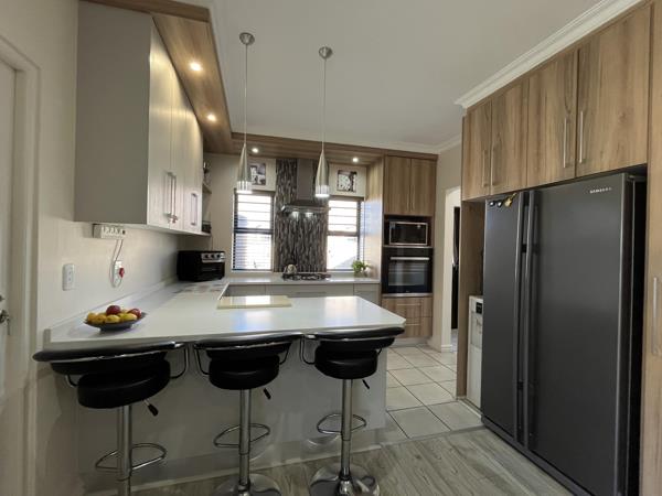 An enclosed patio extends your living space, overlooking a landscaped garden with breathtaking mountain views. The large erf provides ample room for children and pets to play freely. Practical features such as solar and gas geysers ensure energy efficiency, while the double automated garage adds ease and security with direct access to the house.