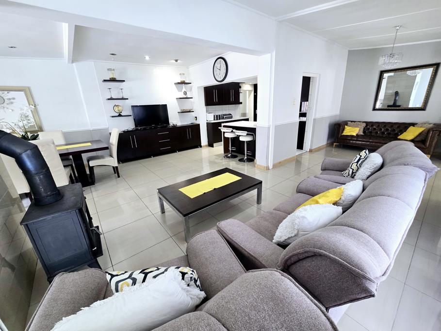 Nestled in the sought-after suburb of Bodorp, George, this 4-bedroom, 3.5-bathroom home offers the perfect blend of comfort, convenience, and potential. Ideal for family living, the property boasts spacious open-plan living areas, including a lounge, dining room, and study, all centered around a cozy fireplace for chilly winter evenings. Sliding doors lead to an expansive covered deck with a built-in braai, overlooking a sparkling swimming pool and offering stunning mountain views perfect for entertaining or unwinding in peace.