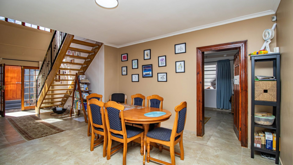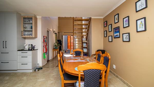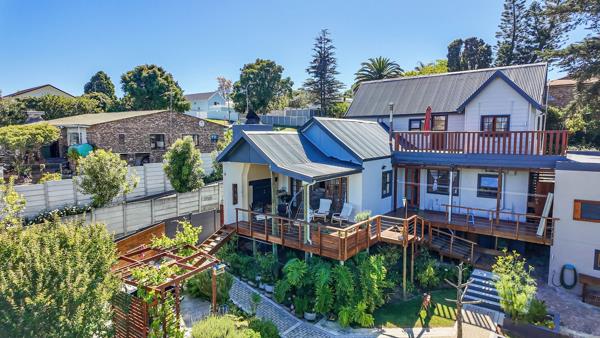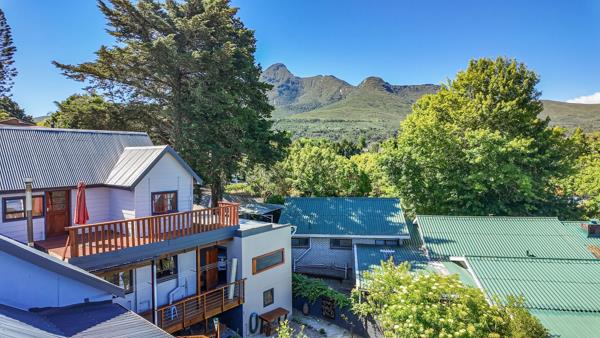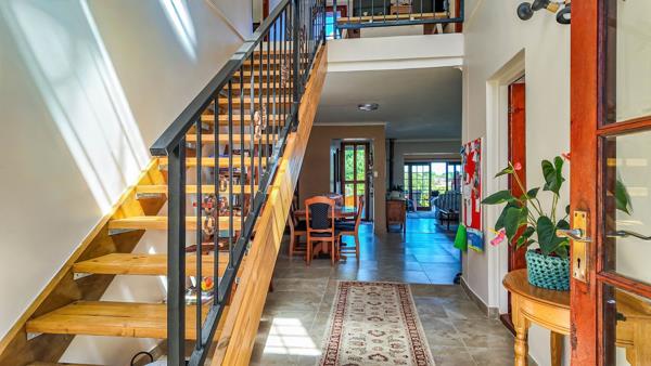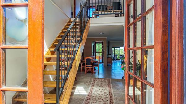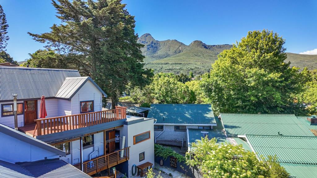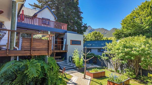 The home features a spacious open-plan kitchen, dining room, and lounge, all flowing seamlessly onto a generous deck with a hot tub, overlooking the mountains and lush garden. The balcony includes a built-in braai, ideal for year-round entertaining.
