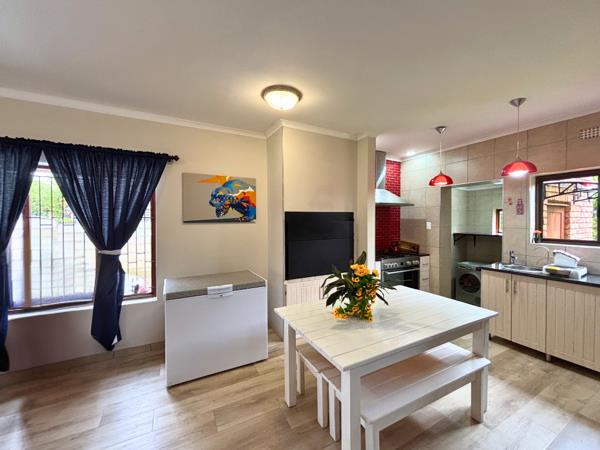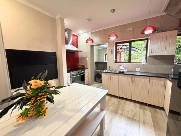 As you step inside, you are welcomed by an open-plan living area that immediately creates a sense of togetherness. The kitchen, dining, and lounge flow seamlessly into one another, making it easy to stay connected with loved ones while cooking or entertaining. The kitchen features a wonderful gas hob paired with a bold red tile backsplash, creating a stylish focal point that adds warmth and personality to the space. A built-in braai completes this inviting area, perfect for relaxed weekends, family gatherings, or cosy evenings at home.