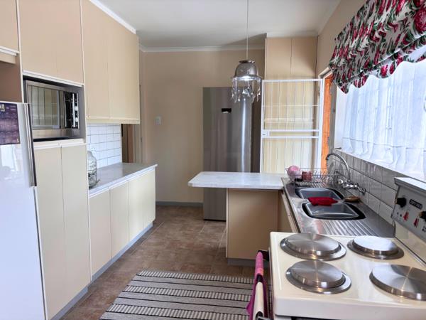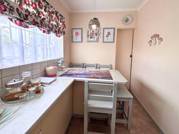 The homes heart, the kitchen, is neat, charming, and highly functional, featuring a cute breakfast nook, ample cupboard space, and a practical walk-in pantry. Adjacent to the kitchen is the well-appointed braai room, doubling efficiently as a laundry area with a basin, ensuring all-weather entertaining is simple and neat.