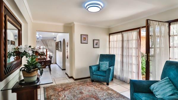 The home features three inviting living areas, perfect for both relaxed family time and elegant entertaining. A welcoming kitchen with a charming nook opens onto a dining area that flows seamlessly into a comfortable lounge, creating a warm and sociable atmosphere. A dedicated TV room adds to the relaxed living options.