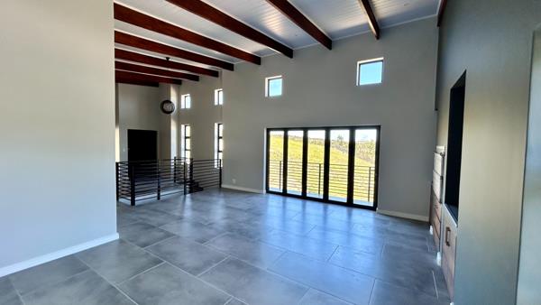 This brand-new, double-storey home in the sought-after Eden Residential Estate combines modern style with country charm. The upper level features an airy, open-plan living space with high trussed ceilings and a modern kitchen that includes a separate scullery. Stack doors open from the living area onto a balcony showcasing stunning Outeniqua Mountain views. The lower level offers a private retreat with three comfortable bedrooms and two stylish bathrooms, while a double garage adds convenience.