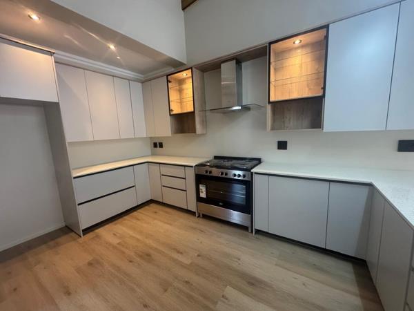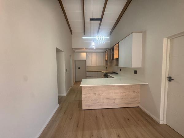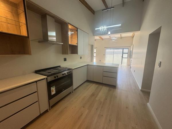 Step inside and feel the inviting sense of space and light that flows through every room. The open-plan lounge, dining, and kitchen area has been designed for seamless living perfect for relaxed family moments or stylish entertaining. Large windows allow natural light to pour in, while a built-in indoor braai makes entertaining effortless all year round. The kitchen is both striking and functional, featuring high-end finishes, custom lighting, bespoke fittings, and a statement multifunction sink, complemented by a separate scullery and laundry area for added convenience.