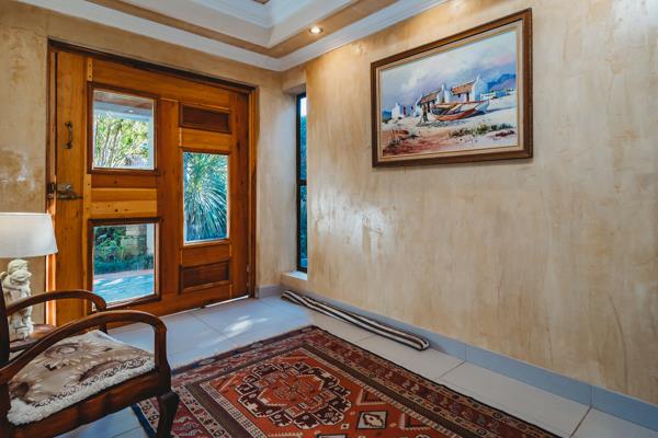 A grand, wooden, pivot door welcomes one into the inviting entrance hall, which leads into the open-plan lounge with cosy fireplace, air conditioning unit and doors opening out to the enclosed braai patio, with built-in, stainless-steel braai. Stacking doors bring the outside in, leading out to the decked patio, overlooking the established, landscaped garden and majestic mountains beyond. The open-plan layout of the living and dining areas, make entertaining guests, a dream!