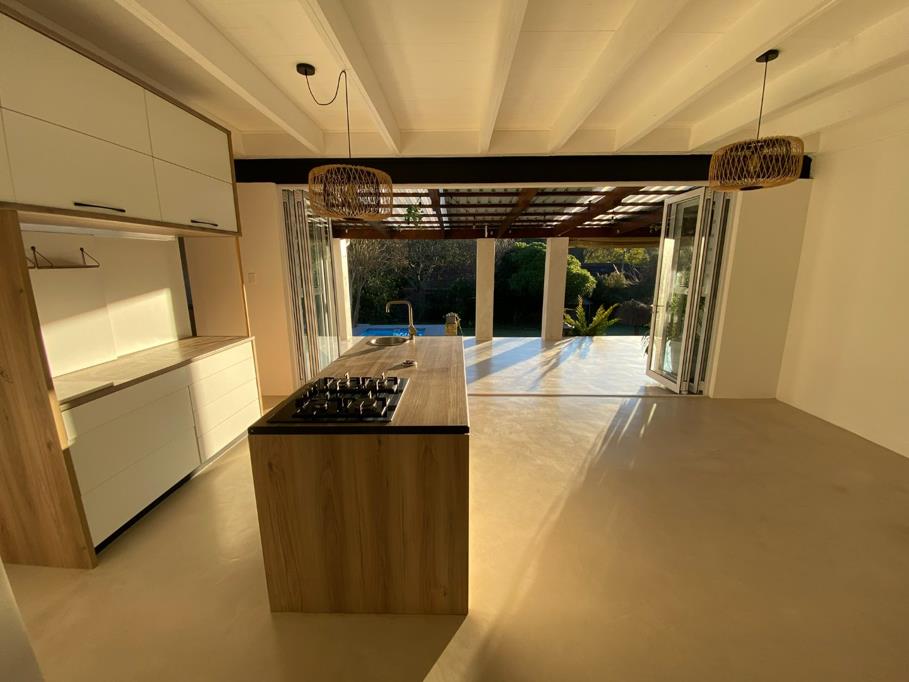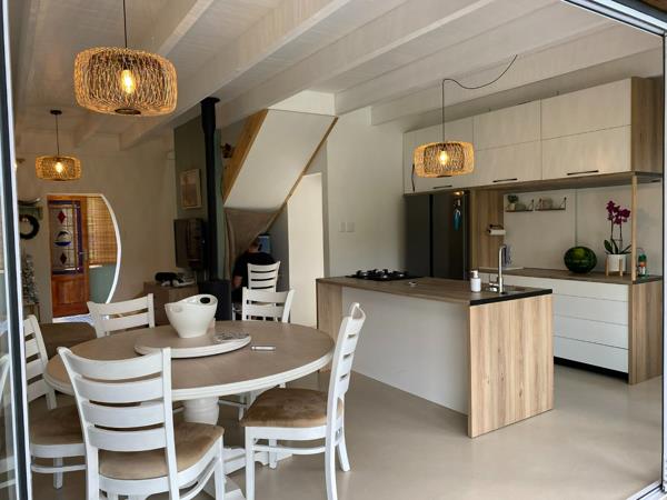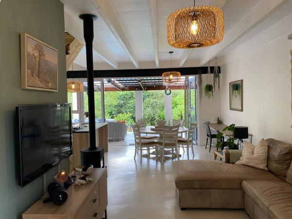 The open-plan kitchen, lounge, and dining area form the heart of the home, complete with a fireplace that makes winters warm and inviting. These living spaces flow seamlessly onto a spacious undercover patio with built-in braai , perfect for entertaining, overlooking a sparkling pool and beautifully established, walled garden that creates a relaxed, holiday-like summer atmosphere.