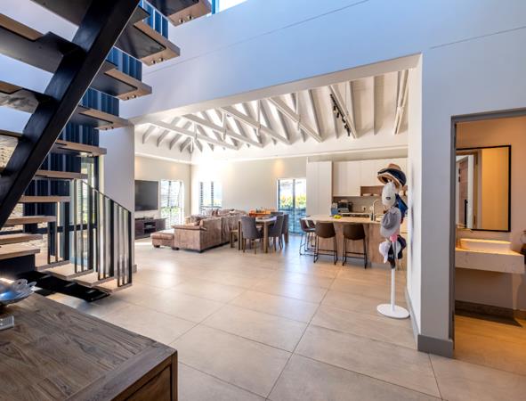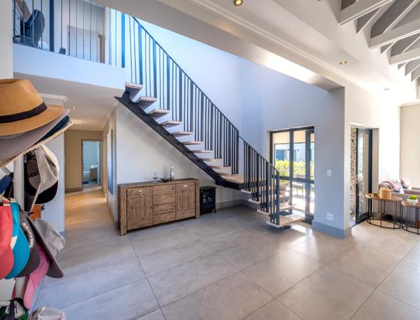 As you enter, you are greeted by a spacious entrance hall featuring a modern staircase. The open-plan living areas and kitchen are accentuated by double-volume ceilings and exposed roof trusses, creating an airy and inviting atmosphere. The sleek, modern kitchen is a chef''s delight, featuring a large center island with a breakfast nook, a gas hob, an electric oven, and a built-in microwave. A separate scullery provides direct access to the double garage, and there is also a separate guest cloakroom for convenience.