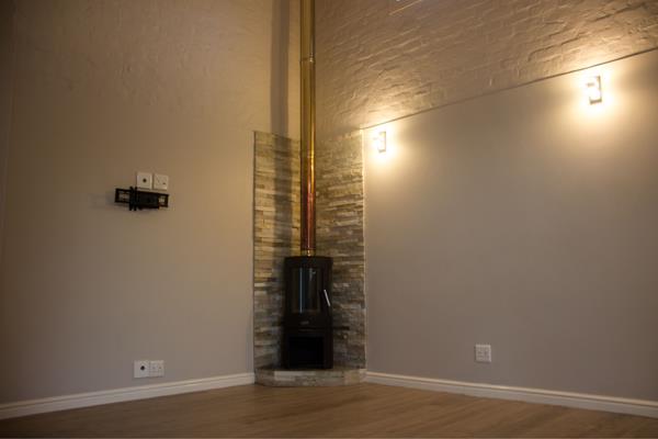 Step inside to soaring high ceilings and abundant natural light flooding the open-plan living spaces, enhanced by tasteful ambient lighting and elegant blinds throughout for easy control and privacy. A striking fireplace with exposed brick accents anchors the lounge, dining, and kitchen area, forming the warm heart of the home.