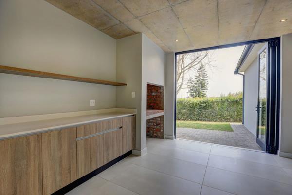 Light-filled open-plan living features high ceilings and large windows throughout. The contemporary kitchen includes separate scullery and laundry, while the indoor braai area opens to the garden via stack doors. Spacious living areas flow seamlessly outdoors through sliding doors.