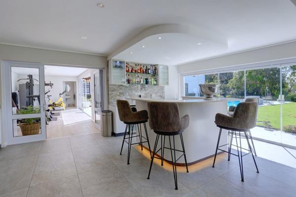 One of the highlights of this residence is the expansive entertainment area a versatile separate building that can be tailored to suit various occasions. It has a gym with separate shower, basin and toilet. The built in braai with a most impressive pub, loungedining area as well as games room transforms gatherings into memorable events, providing a perfect setting for celebrations with family and friends. Then one overlooks the multi-purpose Astroturf sports and tennis court as well as an extended swimming pool