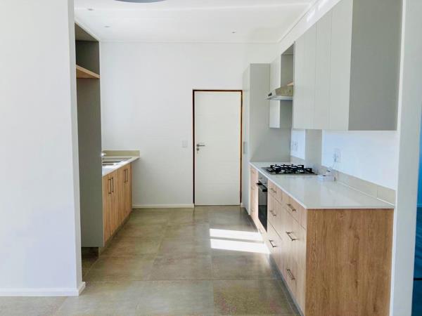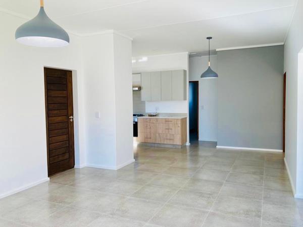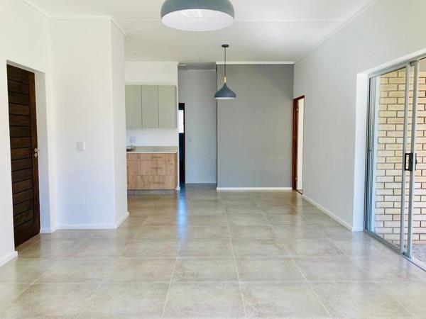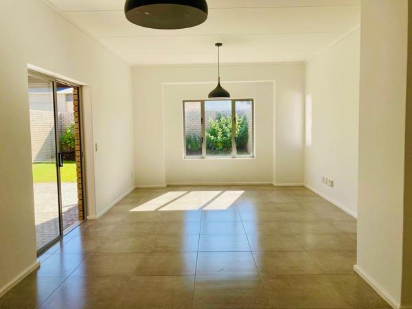 The heart of the home is an open-plan living and dining area, bathed in natural light and finished with modern tiled floors. This inviting space flows seamlessly into a covered patio with a built-in braai, pergola, and enclosed garden, making it an ideal setting for both entertaining and quiet family moments outdoors.