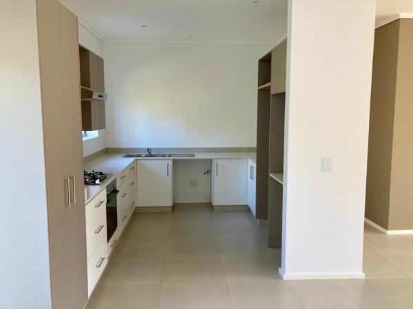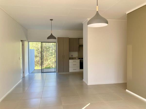 The spacious, open-plan living and dining area is filled with natural light and features modern tiled floors, creating a warm and inviting space. The living area flows effortlessly into a covered patio, which includes a built-in braai, pergola, and an enclosed garden, making it an ideal spot for both entertaining and relaxing with family.