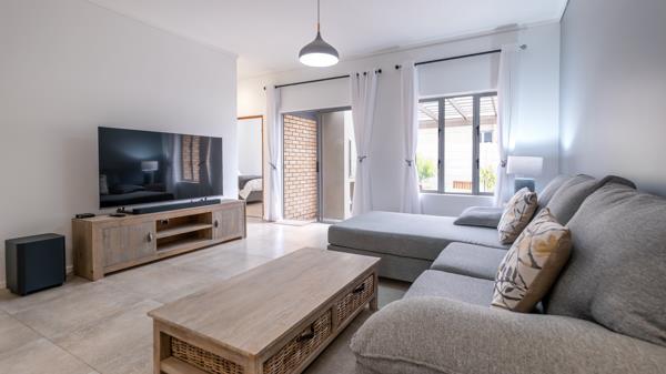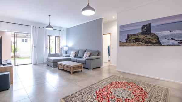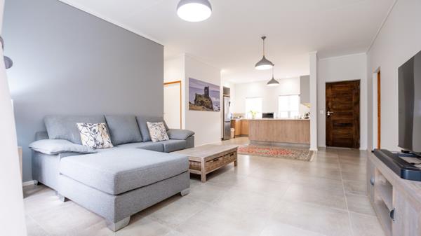 It offers three bedrooms, two bathrooms, with the main bathroom en-suite. The open plan lounge and contemporary kitchen has sliding doors leading to the patio with built-in braai. The neatly manicured garden boasts seven well-established fruit trees.