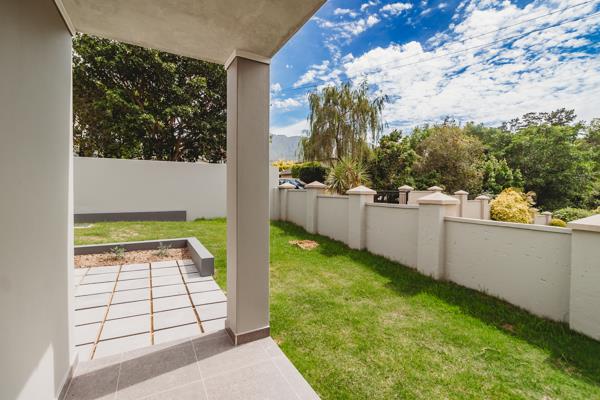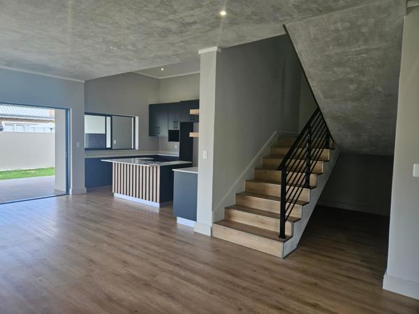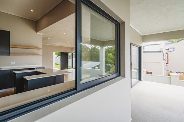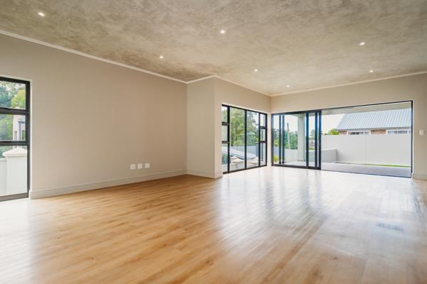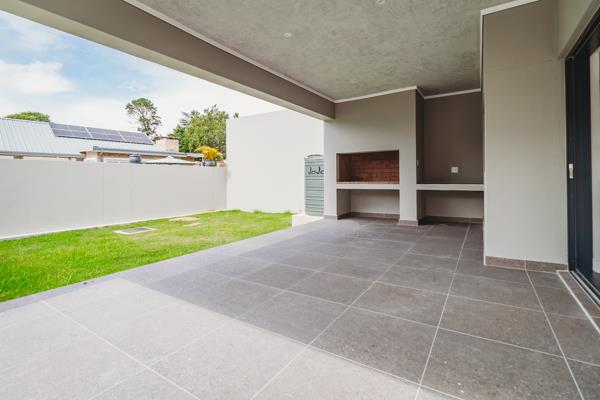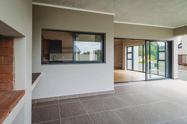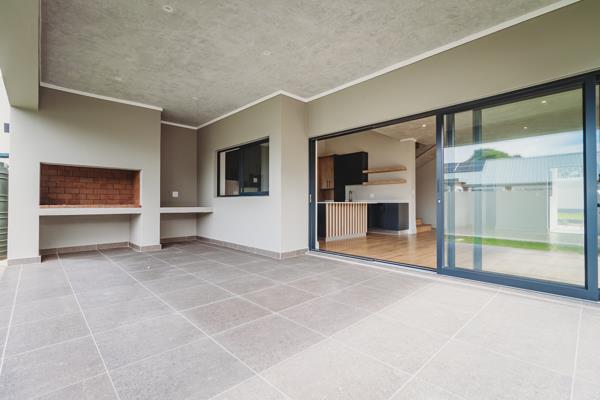 The open plan living areas are bright and airy, with north-facing windows that allow plenty of natural light. A stylish, well-fitted kitchen forms the heart of the living space, and sliding doors open out to a covered patio, with built-in braai, perfect for outdoor relaxation and entertaining. A guest WC on the ground level is a convenient extra.