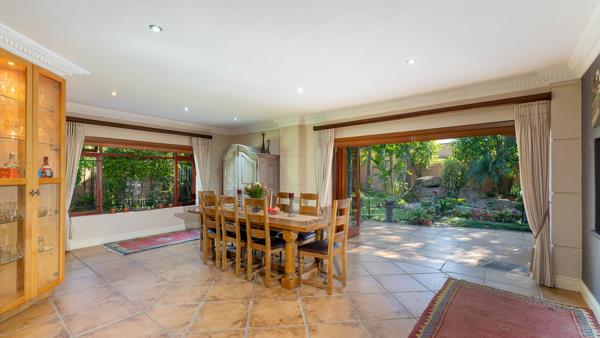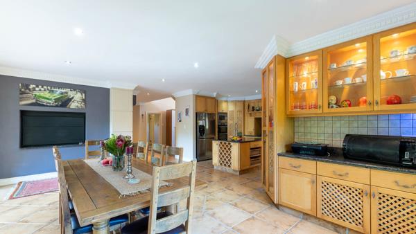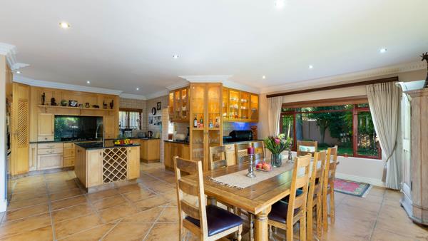 Guest bedroom with full en-suite bathroom and direct access to the garden. A large gourmet kitchen well fitted with yellow wood cupboards granite counter tops and centre island. Gas hob electric oven pantry and scullery to please the busy cook. Dining room area with doors opening to the patio/garden and swimming pool area. The big lounge is cozy, featuring a wood burning fireplace the lounge area - also with doors to the garden. Two x single automated garages both with direct access to the main house.