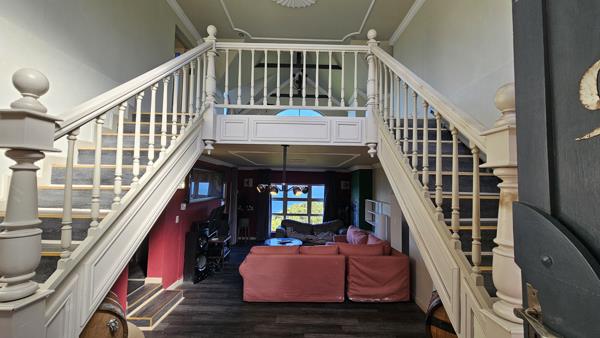 A gorgeous and striking entrance with 2 sets of stairs leading up to a gallery, various rooms, bathrooms and coffee nooks with magnificent ocean and mountain views.