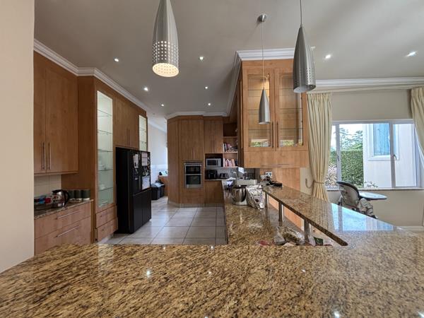A stunning kitchen overlooks the dining area. Both the dining room and lounge open to a covered veranda to the well-maintained garden.