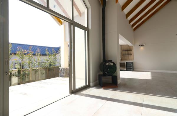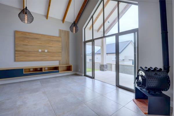 The living area leads to a braaientertainment area with glass stacker doors opening onto two large covered stoeps. Entertain your friends from the bar fridge and wine cabinet next to the braai. The modern wooden burner from The Burner Factory will provide warmth during cold winter evenings.