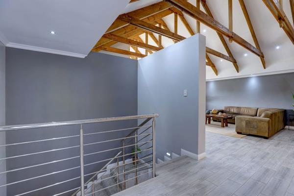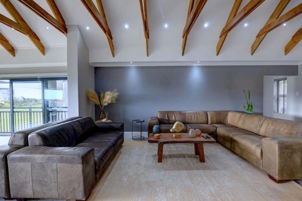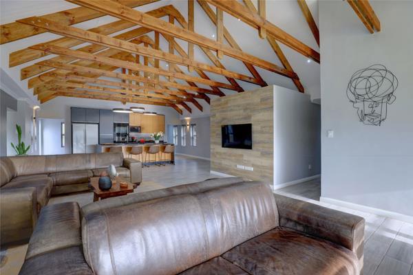 Open plan living with exposed wooden trusses over the modern kitchen, living area and into the indoor braaidining area.