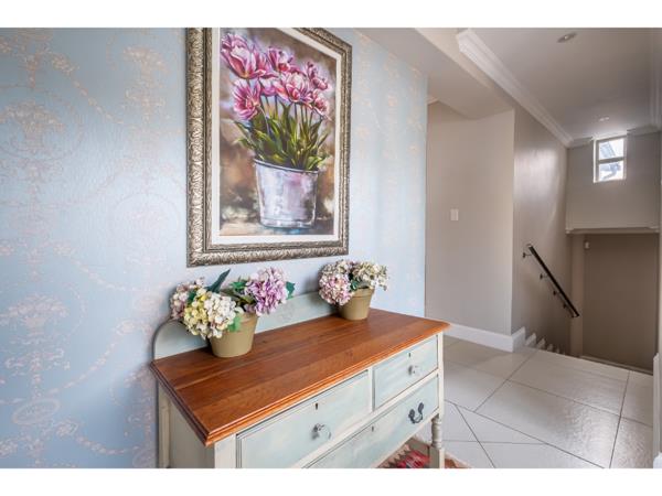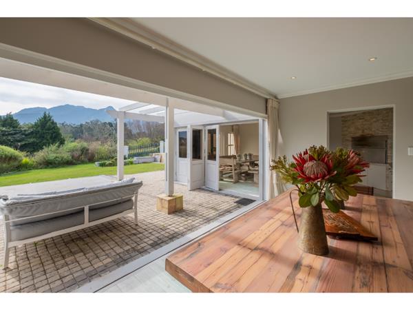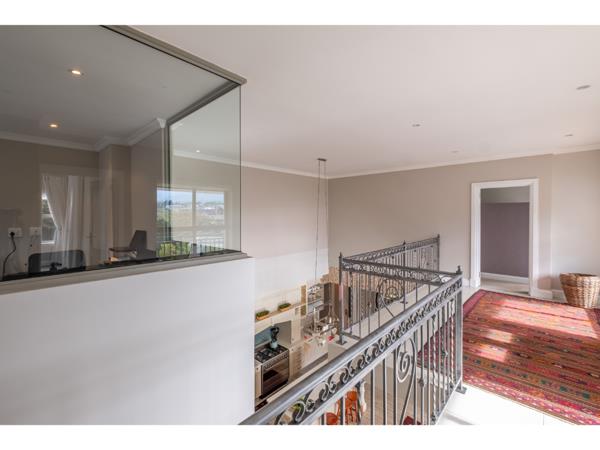 All the entertainment areas are situated on the lower level. It consists of three areas, the middle hosting the kitchen and dining room. The living area and braai room are on opposite sides of the dining room. All three areas open up onto the garden, which features a sparkling pool and an incredible view. A separate toilet on the lower level is available for guests.