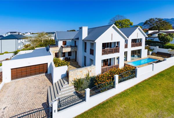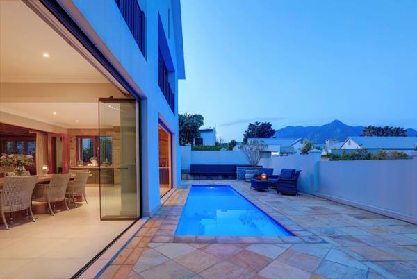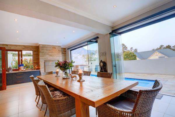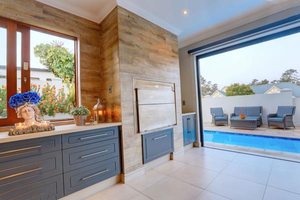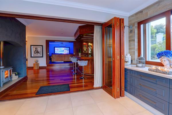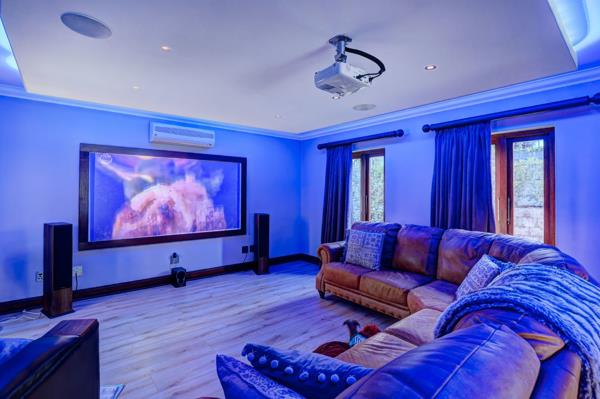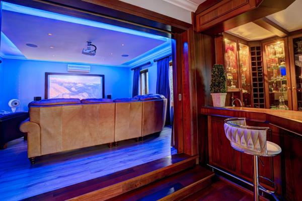 braai patio and pool deck. Dining area with chandelier connects the kitchen and impressive custom fitted bar area with fireplace. Indoor braai patio overlooking the pool is perfect for entertaining. Spacious cinema room completes the entertainment area.