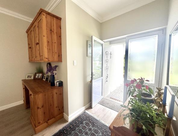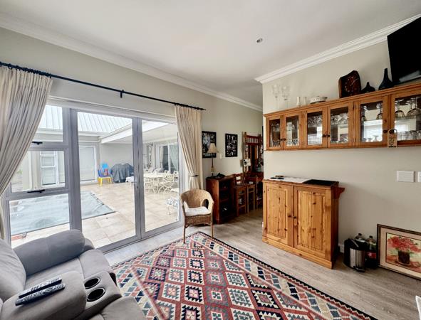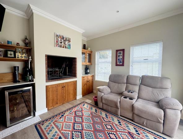 The separate braai room, with French doors, also opens to the patio and pool area. At the heart of the home lies a stylish kitchen featuring a central island with a breakfast nook, white shaker-style cabinets, a gas hob and eye-level oven. A spacious scullery with room for all appliances and a walk-in pantry with shelving