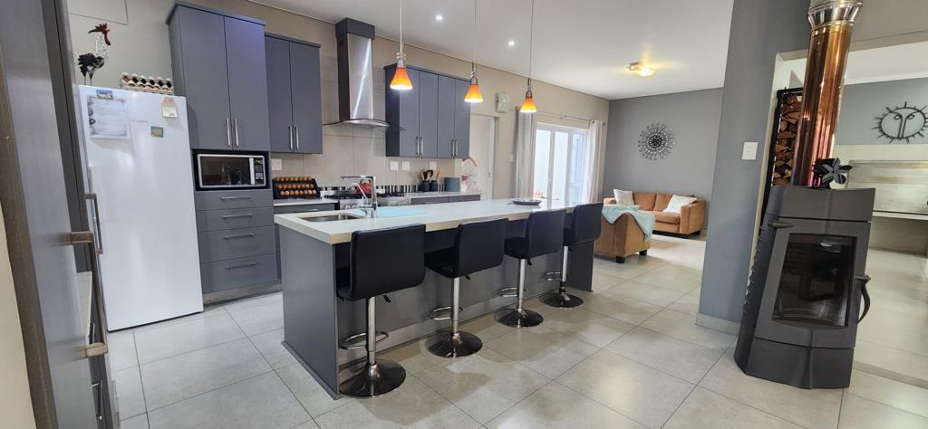 Upon entering, you are greeted with a large open plan kitchen, lounge, and dining room with an inside braai, great for entertaining with an outdoor braai.