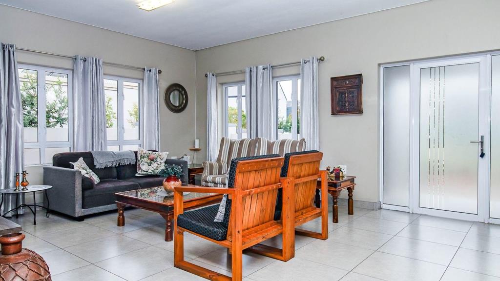 The main bedroom and two additional bedrooms boast en-suite bathrooms, while the remaining two bedrooms share a stylish family bathroom. A convenient guest loo serves the living and entertainment areas. The open-plan kitchen features a separate scullery and pantry, flowing seamlessly into the spacious living and dining areas. A braai room opens onto a north-facing patio with a pergola, perfect for relaxed entertaining or quiet afternoons in the sun. The three-vehicle garage has direct access to the scullery