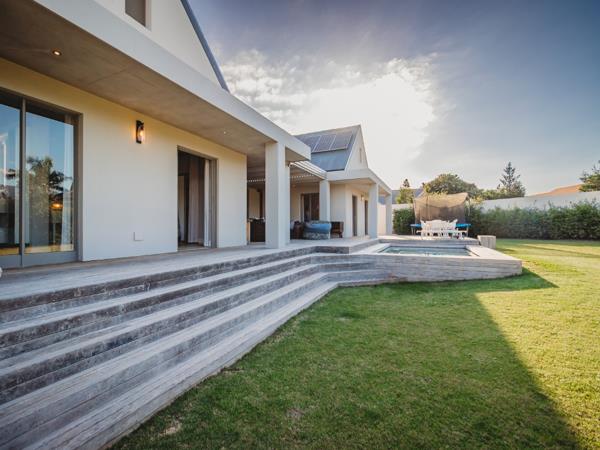 The kitchen includes a central island, modern cabinetry, a walk-in pantry, and a separate scullery with direct access to the second double garage. Accommodation includes a spacious main bedroom with a walk-in closet, full double bathroom, and direct access to the patio a guest suite opening onto a private courtyard and two additional north-facing en-suite bedrooms with sliding doors to the garden. A separate study, four garages, a full solar system, and a water tank complete this remarkable home.