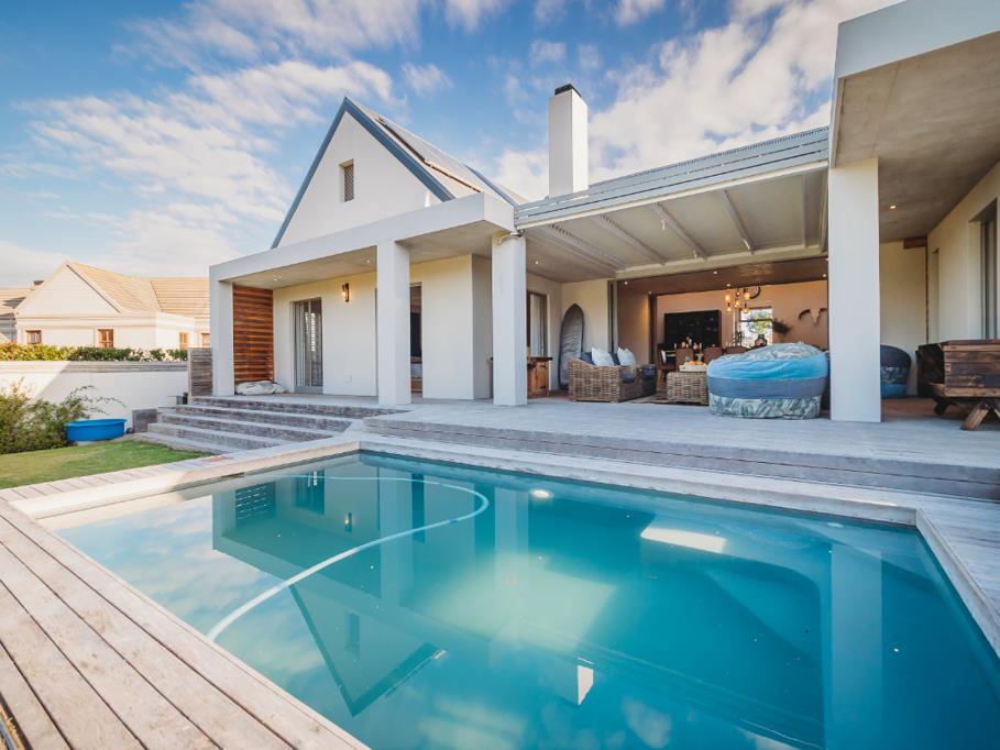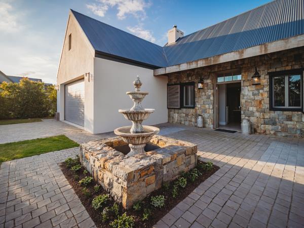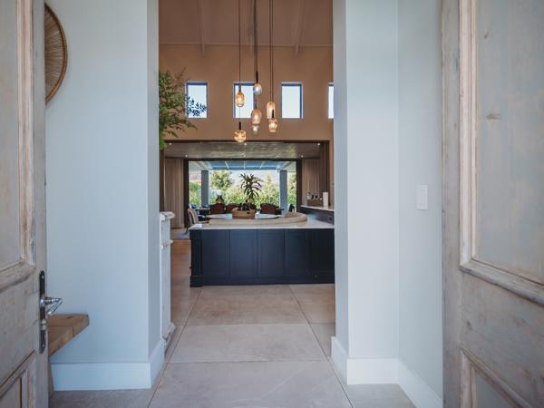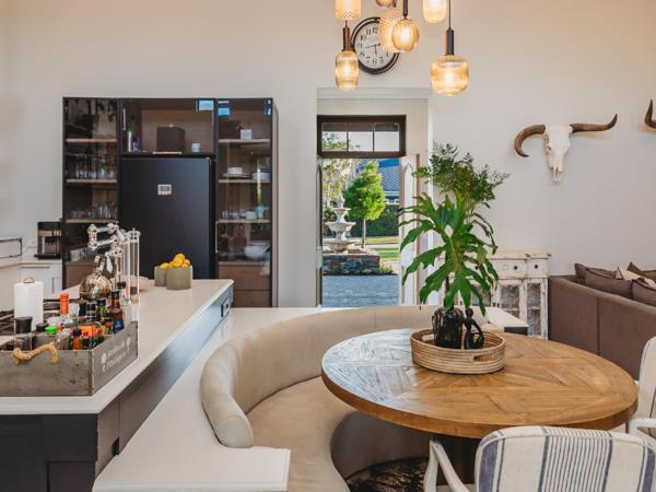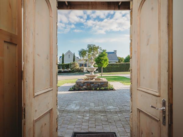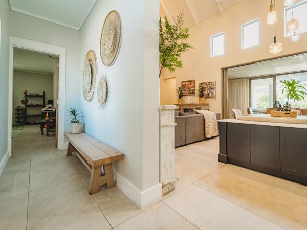 This exceptional single-storey family home is perfectly positioned in a quiet cul-de-sac within the sought-after Kingswood Golf Estate. North-facing and situated on a spacious corner stand, the home embraces natural light and sweeping views, making it ideal for an entertaining-focused family seeking style, comfort, and functionality. Designed with a modern farm-style aesthetic, the entrance welcomes you with a serene water feature, elegant cladding, shutters, and beautiful wooden front doors. Direct access from one of the double garages leads into a foyer with a separate guest cloakroom.