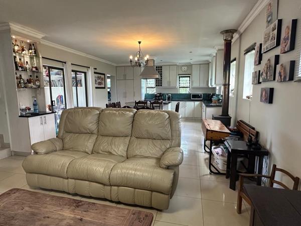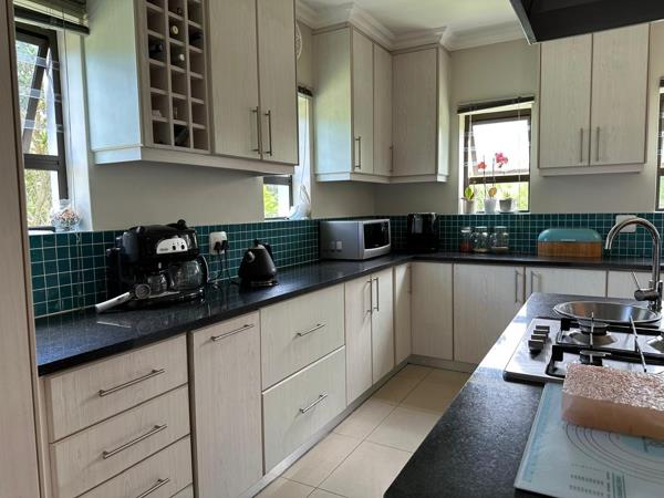 The open plan kitchen has a practical stylish center island. The kitchen joins up with a scullery area. It has a double garage and all outside windows have aluminum frames, designed for low maintenance.