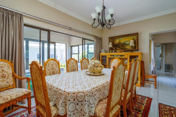 A flower-filled walkway guides you to the grand entrance, which opens into a welcoming foyer. To the right, you will find a spacious open-plan living area that seamlessly integrates with the dining room and kitchen, complete with a separate scullery. A conveniently located guest toilet is ideally situated near the entertaining area.
