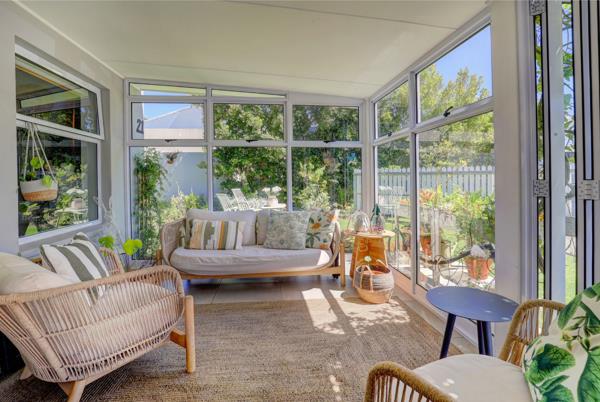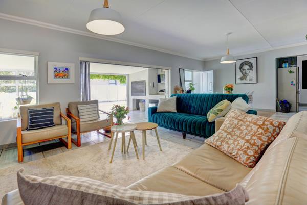 The fantastic open plan living areas with fireplace, and modern, compact kitchen leads through stacker doors to a covered and enclosed patio with braai area, opening onto the beautifully landscaped garden.