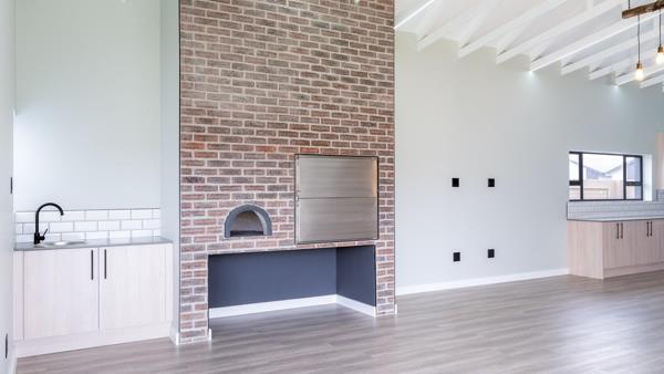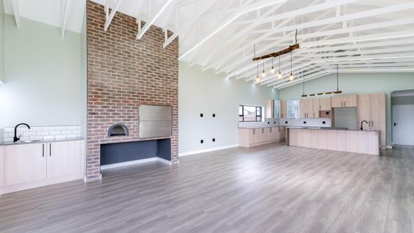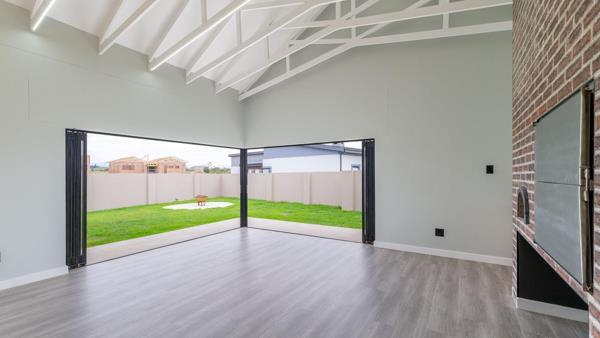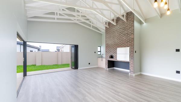 This stylish, modern home in Le Grand Estate, is set amidst a farming community, bordering on the Indian Ocean with the Outeniqua Mountains in the distance. It has been constructed with attention to detail, complete with every necessity for living a contemporary yet relaxed lifestyle. The living space is double volume, open plan and flooded with natural light. The kitchen section has ample, elegant cupboards plus a popular waterfall style centre island. Lights wrapped on a wooden beam log add a unique ambience, bringing warmth and charm to this area. A stainless-steel braai and pizza oven compliment the inviting picture. A separate scullery, tucked away behind the kitchen, serves as the entrance from the large double garage with built-in cupboards for extra storage. The entrance hall boasts loads of linen cupboards. All three generous sized bedrooms are conveniently served by their own modern bathrooms. Glass stacking doors lead from the lounge to an appealing outside entertainment spot, perfect for spending time unwinding with family & friends and pets. A second distribution box makes provision for installing an inverter and solar panels. Additionally, there are two 2,500 L water tanks with a motor and gas geysers.