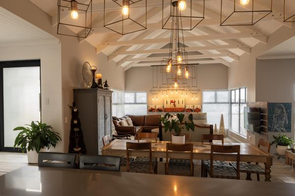 Entertainment will be enjoyable all year round, with the built-in braai, in the braai room which extends to a covered patio. Various outdoor areas were created in the private garden, from which one can experience the magnificent sunsets and peacefulness of this exclusive estate.