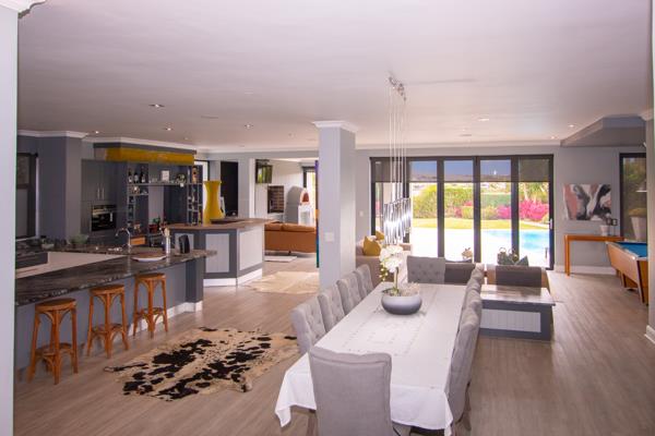 Open Plan - Dining Room, Kitchen, Lounge, Pool Room, Bar & Braai Room. This large space is logically divided with support walls and feature lighting and gives the space a sense of luxury. All areas have laminate flooring.