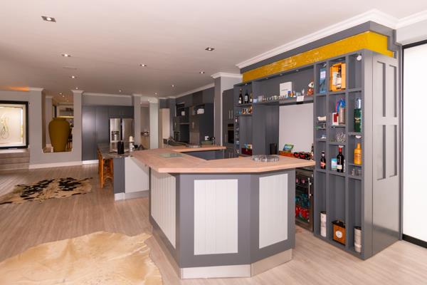 Bar - cabinetry and shelving, bar counter, open plan to braai room.