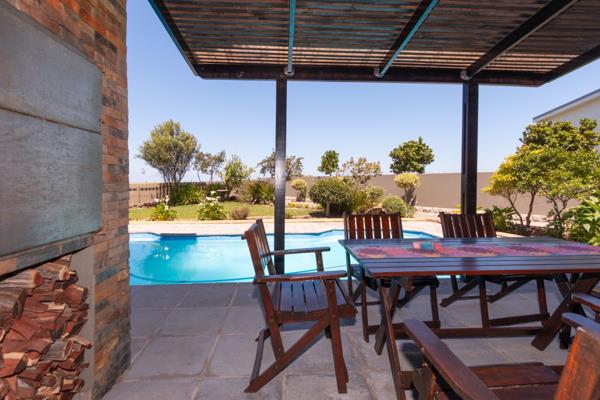 Under Cover Braai - Stainless steel braai under patio roof overlooking the swimming pool to the garden and golf course side.