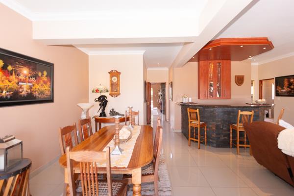 Lounge with airconditioner, TV point and dining room with built in fire place. Coffee station on the side of the kitchen.