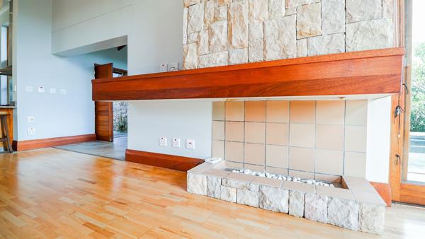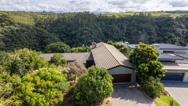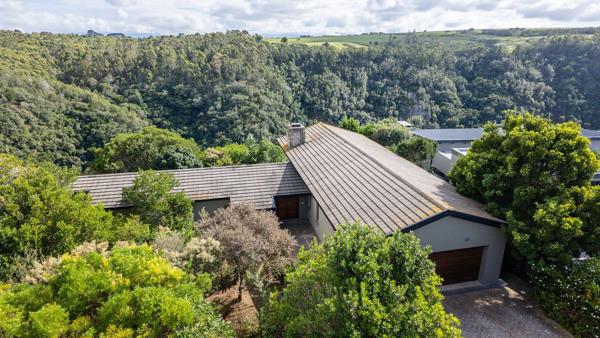 The heart of the home lies in the open-plan living area. The chef-inspired kitchen boasts a gas hob, electric oven, extractor fan, double fridge, granite countertops, solid wood cabinetry, a prep bowl, and built-in wine racks. All enjoy a northern exposure overlooking the living room, deck, and forest. The adjacent dining area flows seamlessly into the voluminous lounge, characterized by exposed beams, wooden floors, a rock-clad gas fireplace, and expansive windows offering phenomenal views. The natural accents of wood and rock cladding allow the home to blend seamlessly into its surroundings. This space opens onto a wrap-around wooden deck with views of the dramatic Gwaing River valley, distant farms, and the Outeniqua Mountains. The built-in braai extends the living space and fosters a strong connection with the indigenous forest. The sound of the water flowing below transports you to a different world.
