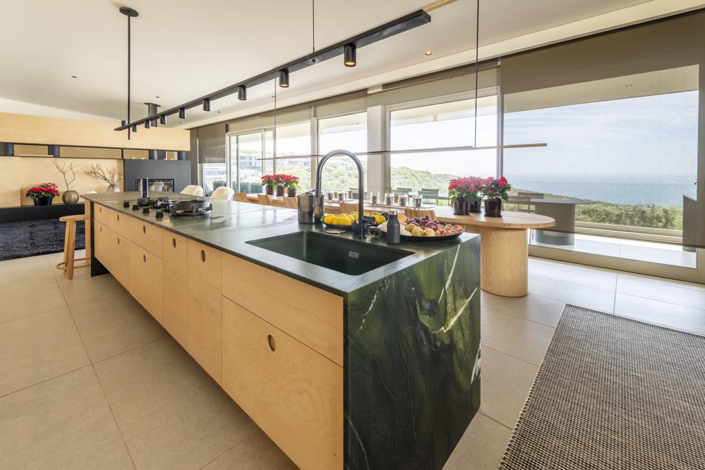- Open-plan designer KITCHEN featuring Avocado leather stone countertops, & Zimblack stone finishes throughout