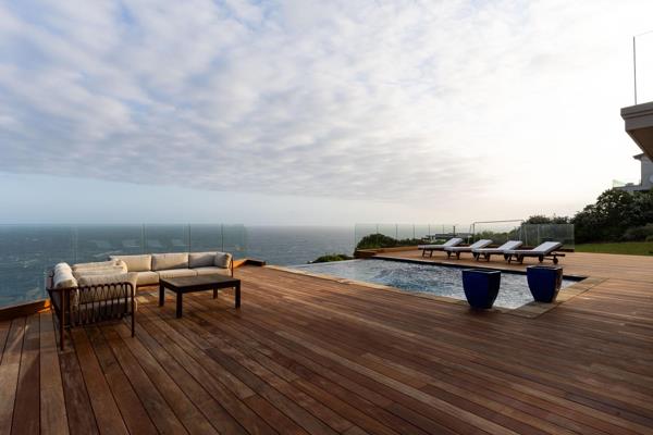 - 180-degree ocean views from the spacious entrance area- Large, dramatic entrance doors- Modern kitchen with black granite tops, white cabinetry, and cleverly concealed appliances- Formal dining room with mind-blowing sea views- Alfresco dining area with built-in coffee station and exposed wooden beams- TV lounge with fireplace flowing out to the patio with built-in braai/barbecue- Magnificent rim-flow infinity pool with expansive deck perfect for social gatherings- Private wine cellar ideal for storing vintage wine collections or hosting exclusive food and wine pairing evenings