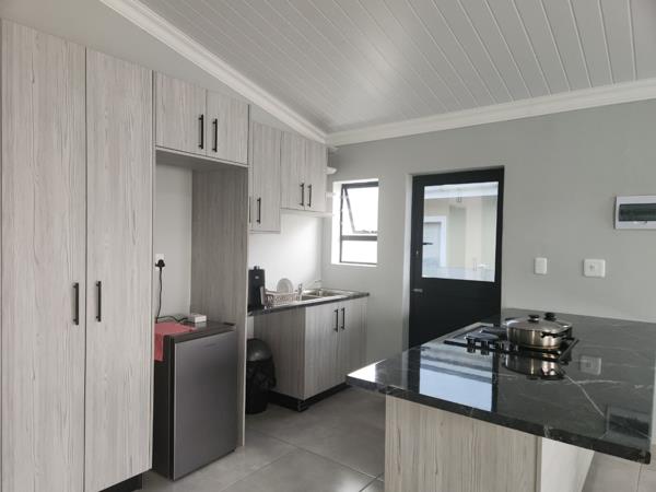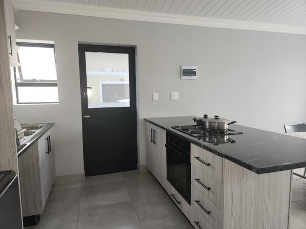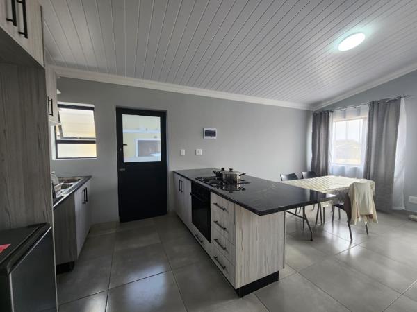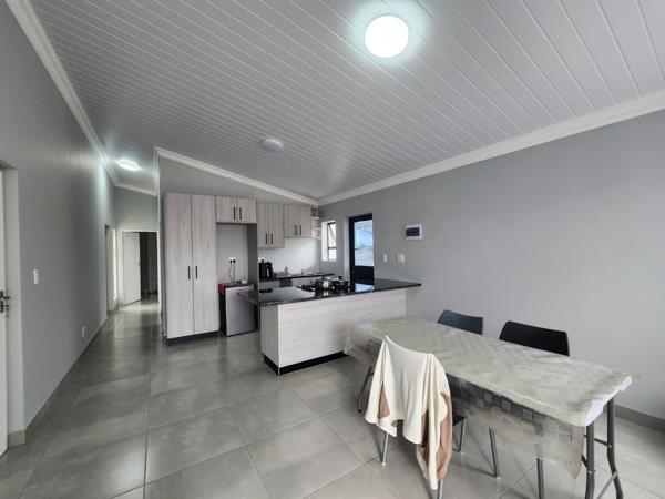 The home features a spacious open-plan kitchen and living area, creating a warm and inviting space for everyday living and entertaining. The modern kitchen includes built-in cupboards for ample storage, while large aluminium windows allow plenty of natural light to flow through the home.