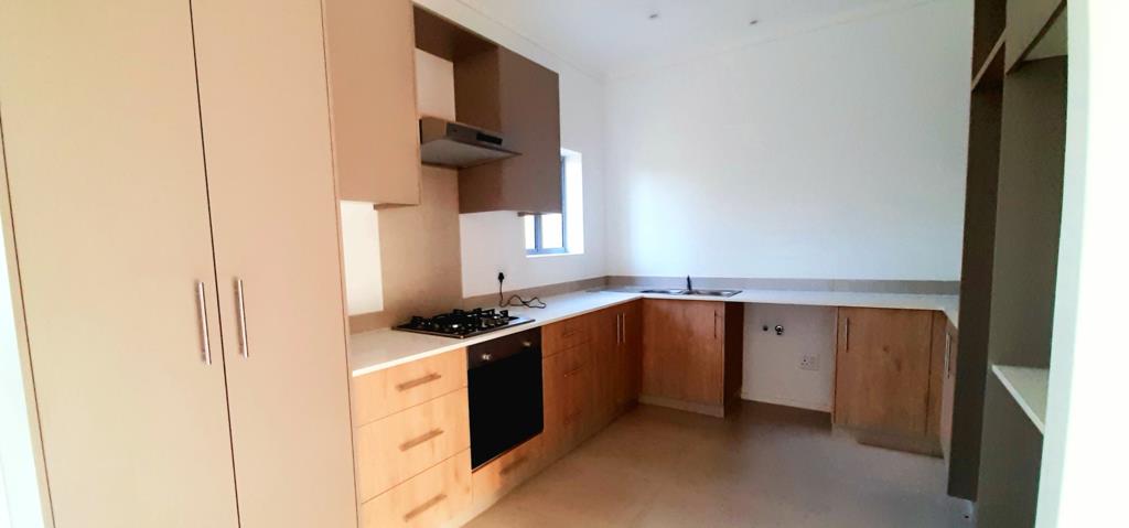 The modern kitchen offers plenty of storage areas and is positioned semi open plan to the living area which opens onto the patio area with a built in braai.